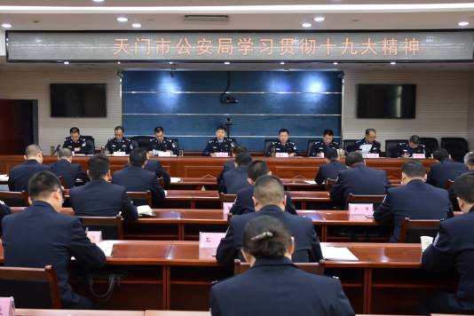 10月31日,天门市公安局召开党委扩大会议,专题学习贯彻党的十九大精神。在家的局党委成员、各单位主要负责人参加,政府党组成员、公安局党委书记王军辉主持会议并作重要讲话。