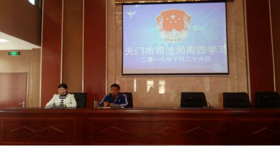 10月26日,天门市司法局在六楼大会议室进行了每周四集中学习十九大精神,市司法局党组成员、工会主席刘哲谦主持会议。局机关全体人员及市社会矛盾调解中心负责人共计30余人参加会议;10月30日,市司法局在六楼大会议室开展了“支部主题党日”活动专题学习十九大报告内容。