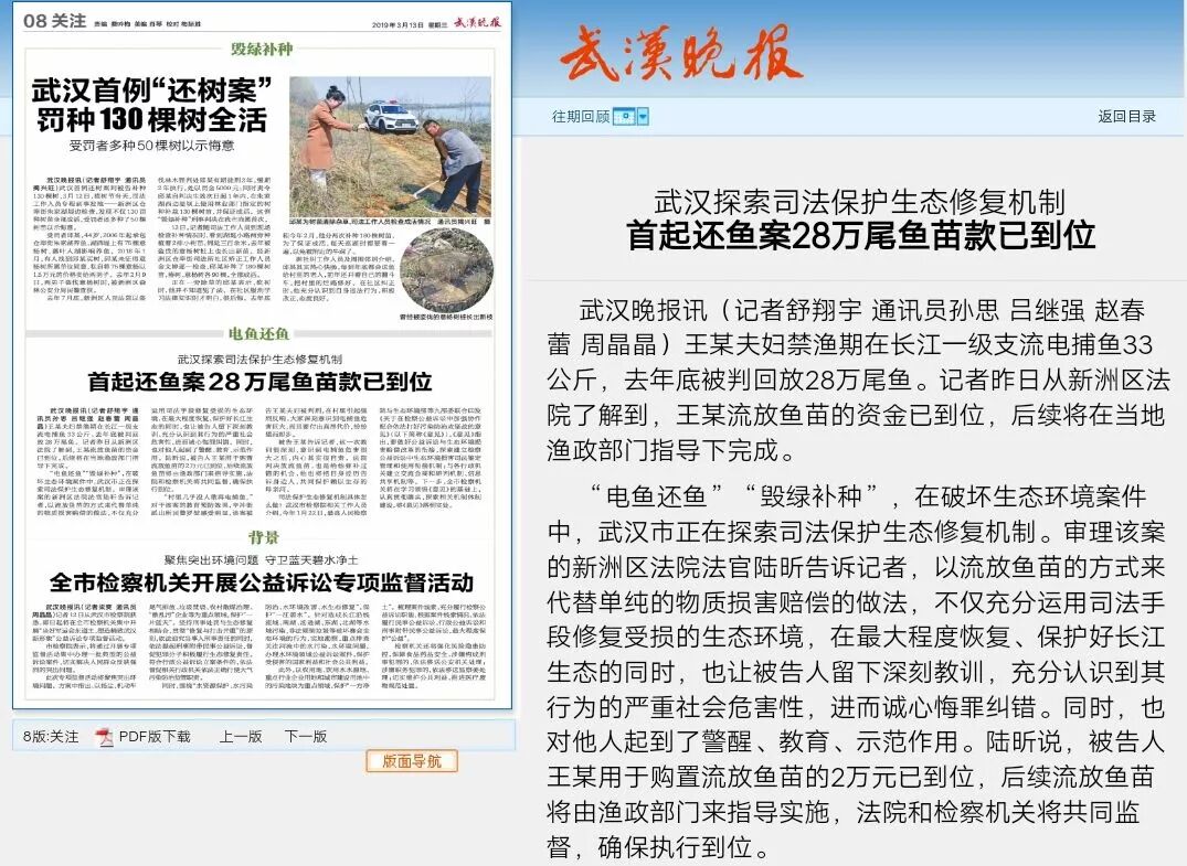 日前,武汉晚报和长江日报分别以《武汉探索司法保护生态修复机制——首起还鱼案28万尾鱼苗款已到位》、《“电鱼还鱼”“毁绿补种” 环保法律“牙齿”越来越硬——在武汉破坏生态环境都是要还的》为题,报道了武汉市新洲区检察院提起的首例非法捕捞水产品刑事附带民事公益诉讼案——武汉市新洲区居民王某夫妇禁渔期在长江支流举水河电捕鱼33公斤,被判回放成鱼132公斤、幼鱼28万余尾。