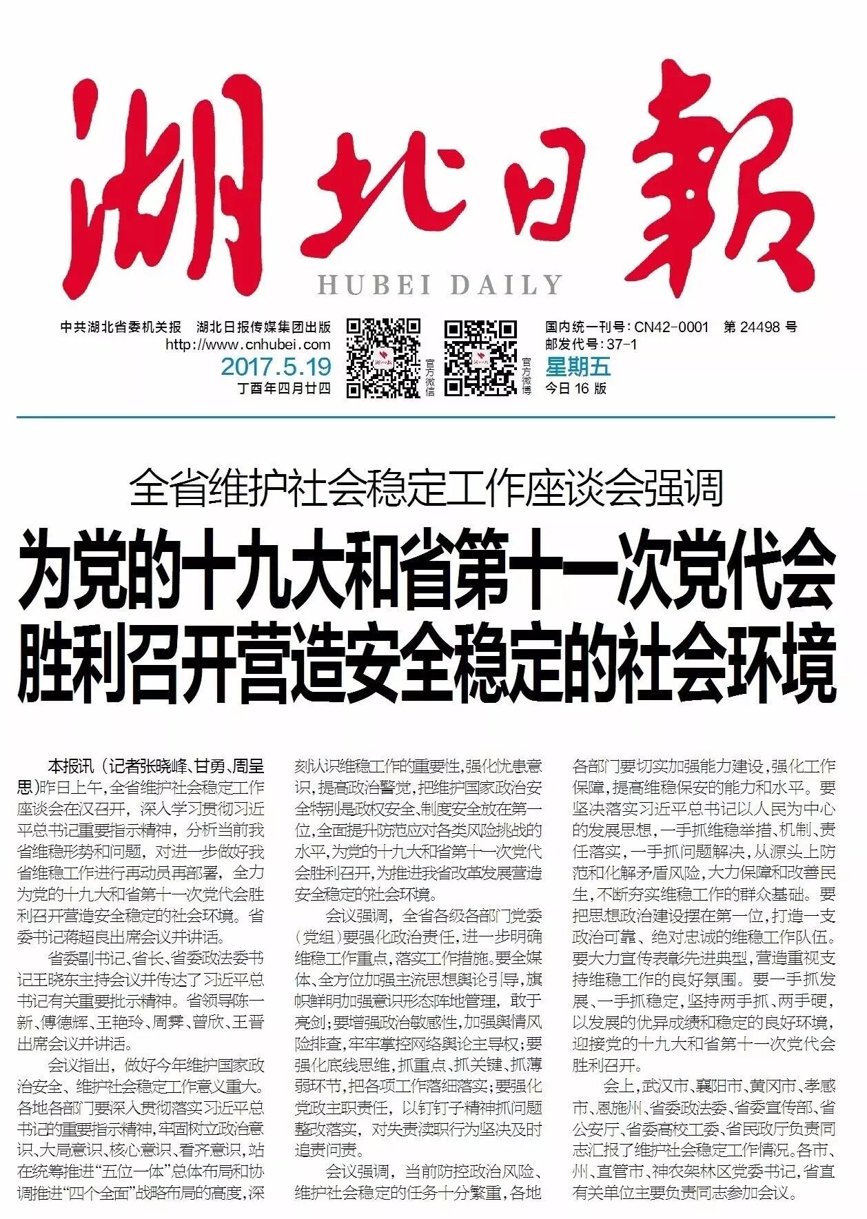 5月18日上午,全省维护社会稳定工作座谈会在汉召开,深入学习贯彻习近平总书记重要指示精神,分析当前我省维稳形势和问题,对进一步做好我省维稳工作进行再动员再部署,全力为党的十九大和省第十一次党代会胜利召开营造安全稳定的社会环境。省委书记蒋超良出席会议并讲话。